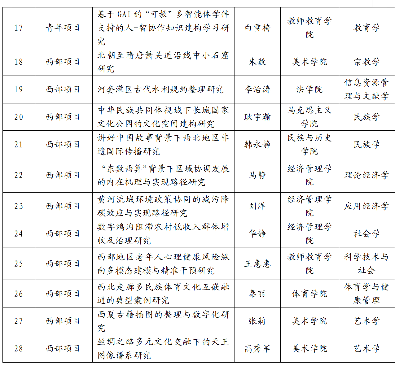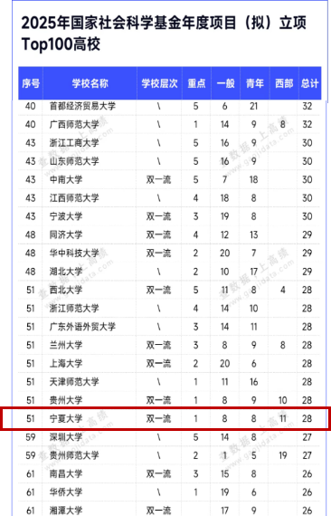 近日,2025年国家社科基金教育学、艺术学和年度项目立项结果先后正式公布,我校共有28个项目获得立项资助(其中重点项目1项、一般项目8项、青年项目8项、西部项目11项),立项数创“十四五”期间我校国家社科基金项目立项最好成绩。2025年度我校国家社科基金立项数在全区位居第1名(约占全区立项总数的55%),在Z14高校中位居第4名,在全国高校中位居第51名。目前,仍有部分国家社科基金项目(如冷门绝学研究专项、高校思想政治理论课研究专项、后期资助项目等)正在组织申报或评审中。