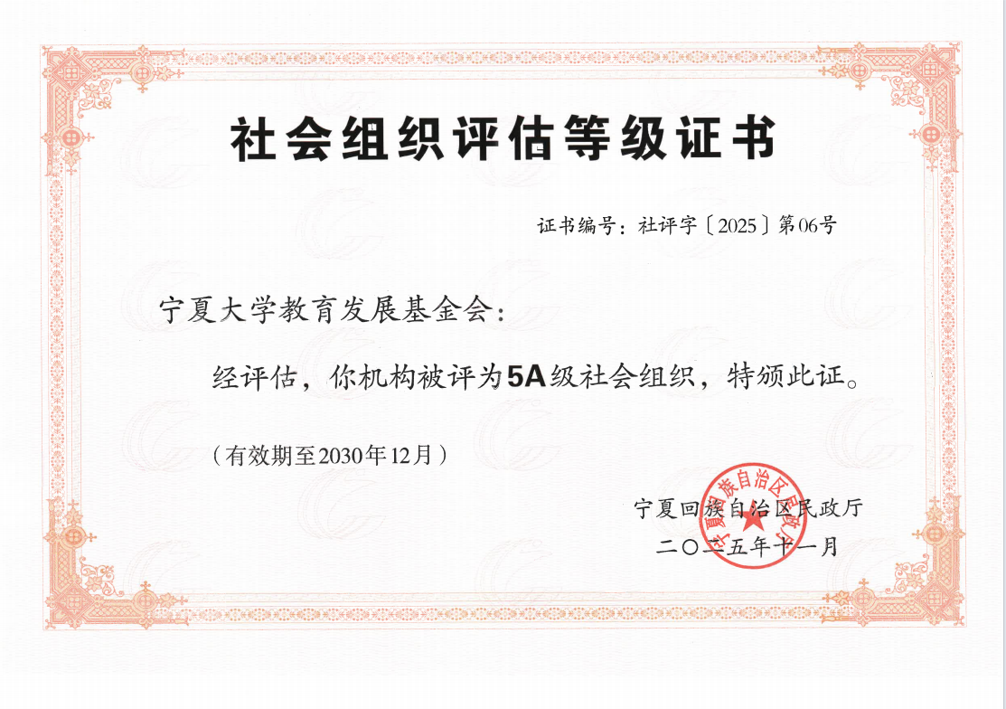 近日,自治区民政厅公布2025年度社会组织等级评估结果,宁夏大学教育发展基金会获评最高等级5A级社会组织,成为区内首个获此殊荣的高校基金会,为全区高校基金会的规范化、专业化发展树立了标杆。