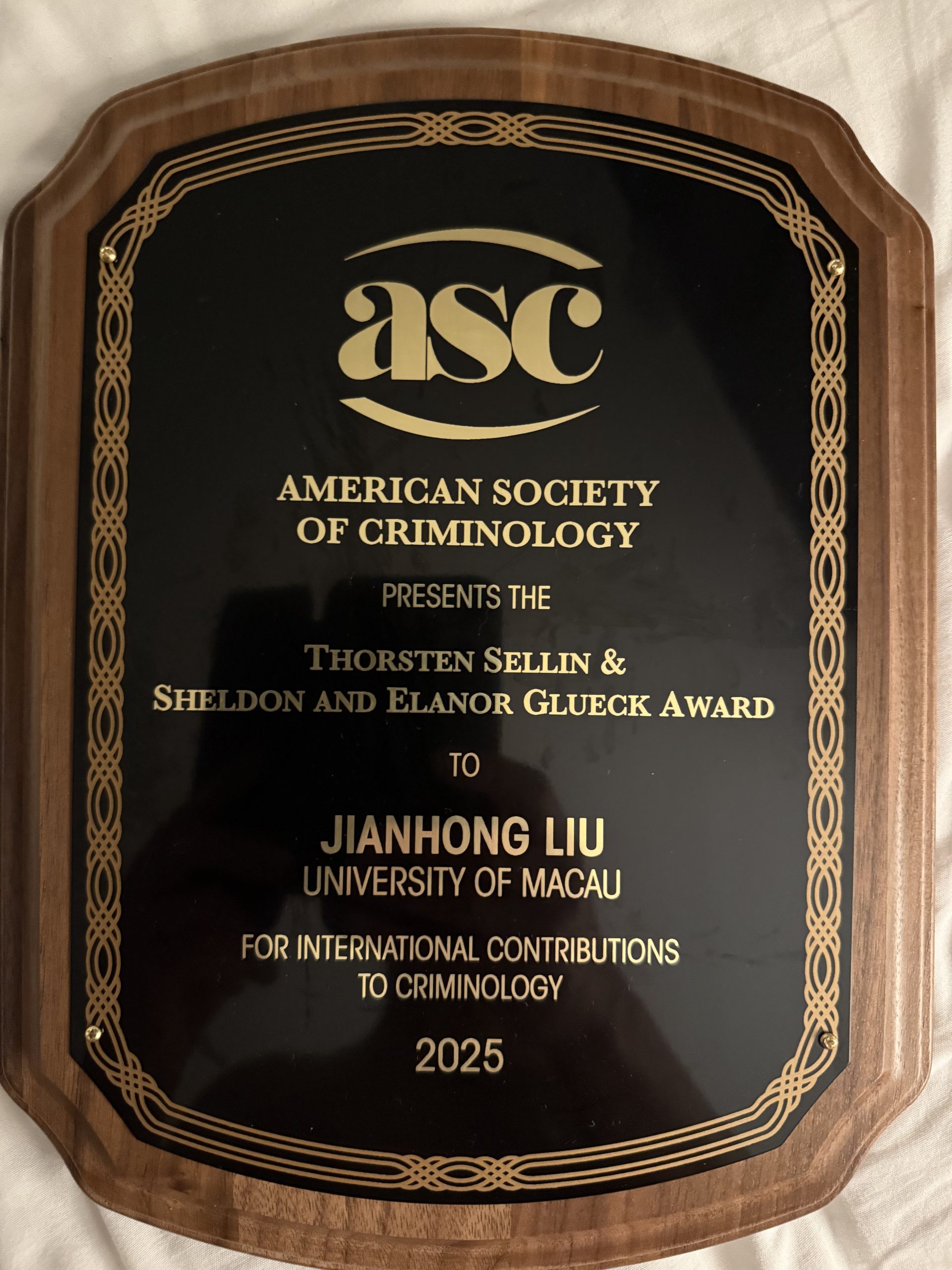 11月12日,在美国华盛顿举行的ASC年会上,学会主席Katheryn Russell-Brown向刘建宏教授颁发“塞林&格卢克奖”。此奖项旨在表彰刘建宏在国际及比较犯罪学领域的持续杰出贡献,评选委员会高度肯定其研究对全球犯罪学知识体系产生的深远影响。该奖项自1974年设立以来,全球仅有两位亚洲学者获此殊荣,彰显了刘建宏在国际学界的领军地位。