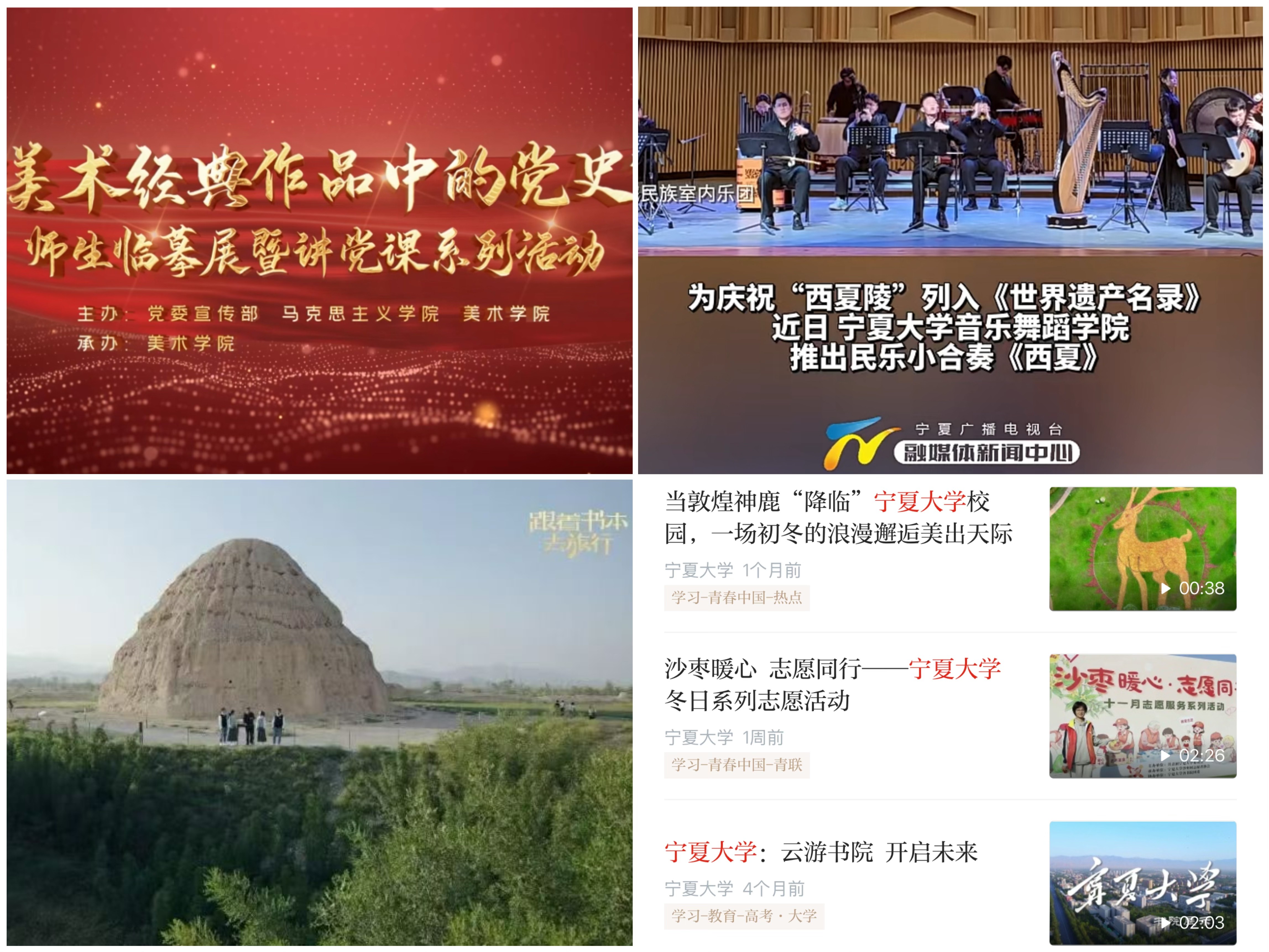 文化传承创新亮点纷呈,原创史诗舞台剧《沙枣树· 路与梦》以历史叙事展现宁夏大学在时代浪潮中的发展历程,生动诠释宁大人“不怕困难,不畏风寒;根深叶茂,本固枝荣”的精神底色;原创歌剧《山河同路》以跨时空青春对话的具象化视角将“行走的思政课”隽永呈现,让红色血脉接续流传。“艺术+思政”育人模式推陈出新,60幅党史主题画作将百年风华浓缩于方寸之间,“音乐党课”用“讲唱演”和“视听悟”的沉浸式学习直抵人心。从《跟着书本去旅行》的沉浸式文化体验、纪录片《石榴花开》的生动写照,到西夏陵海外宣传片的国际传播,一系列有分量、有温度的外宣活动,向全社会展示宁大故事。“贺兰山论坛”星光熠熠,神舟十六号航天员桂海潮,中国科学院院士张继平、郑志明,北京大学翟崑和清华大学达巍、吴大辉等顶尖专家学者的智慧分享,为师生打开仰望星空的窗口。线上线下,育人润心,宁夏大学将宣传思想文化工作转化为内涵式发展的动能,在守正创新中谱写育人新篇。