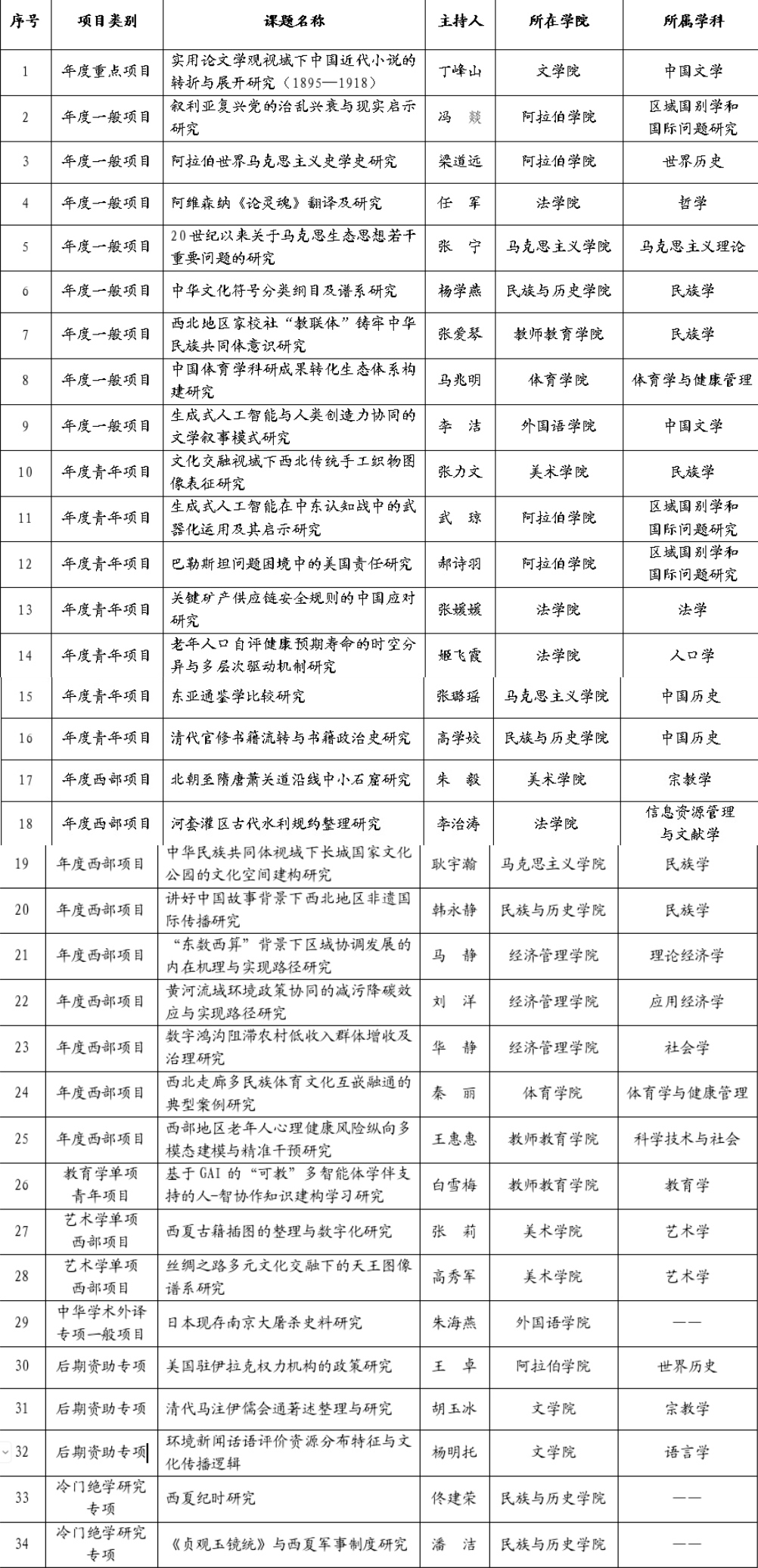 宁夏大学2025年国家社会科学基金项目立项名单