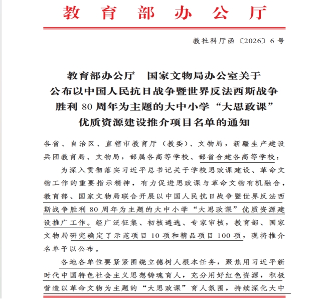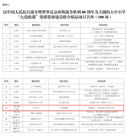 近日,教育部相继公布首批新时代学校思想政治教育典型案例、以中国人民抗日战争暨世界反法西斯战争胜利80周年为主题的大中小学“大思政课”优质资源建设推介项目入选名单。我校组织申报的《建强“四个体系”构建铸牢中华民族共同体意识“大思政”育人机制》成功入选首批新时代学校思想政治教育典型案例“新时代伟大变革实践育人大课堂”部分,《激荡塞上:抗战洪流中的烽火宁夏》凭借鲜明的红色主题、独特的历史视角、丰富的资源呈现与创新的育人模式,成功入选大中小学“大思政课”优质资源建设推介精品项目。两个项目均由马克思主义学院组织申报。