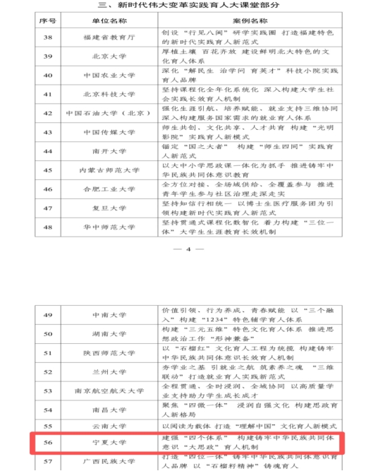首批新时代学校思想政治教育100个典型案例对标新时代立德树人工程布局,包括立德树人机制综合改革、党的创新理论主课堂、新时代伟大变革实践育人大课堂、数字时代网络育人新课堂、教师队伍和基层组织建设等5部分,系统涵盖思政工作相关体制机制、平台载体、队伍支撑、协同保障、评价反馈等各方面。《建强“四个体系”,构建铸牢中华民族共同体意识教育的“大思政”育人机制》案例全面贯彻习近平总书记考察宁夏重要讲话精神,将铸牢中华民族共同体意识融入办学治校、教书育人全过程,积极发挥关联学科引领、宣教平台辐射、文化活动浸润作用,建强制度、教育、实践、研究体系,扎实推进各族师生共居共学、共建共享、共事共乐“六共”新时代铸牢中华民族共同体意识育人新格局。在体制机制建设方面,不断健全组织管理机制,打造典型培育机制,构建了宁夏大学民族团结进步模范培育和选树机制,推动铸牢中华民族共同体意识入脑入心。在建立教育体系,凝聚育人共识方面,将铸牢中华民族共同体意识全面融入思想政治理论课和课程思政示范课,推进思想政治理论课“6+1”课程群教育教学改革,开设《中华民族共同体概论》通识教育课程,建设“大思政”宣教主阵地,建成“石榴花开润塞上、铸牢中华民族共同体意识的宁夏实践”主题展馆等平台,持续开展民族团结进步教育。在搭建实践体系,拓展教育渠道方面,将研学实践作为加强和改进学生思想政治教育的重要途径,形成了“六共”相融、知行合一的铸牢中华民族共同体意识实践体系。在构建研究体系,强化理论支撑方面,依托部区合建宁夏大学民族学学科群,建设国家民委中华民族共同体研究基地、教育部高校人文社会科学重点研究基地、部省共建阿拉伯国家研究协同创新中心,构建正本清源、守正创新的铸牢中华民族共同体意识理论研究体系。2002年以来,累计选派120多名研究生支教团志愿者,先后服务于宁夏南部山区的十余所学校,受益学生近6000人,141名应届毕业生成为“西部计划”志愿者,涌现出国家级模范个人1人、区级模范个人2人、自治区级民族团结进步模范集体1个,形成学有榜样、赶有目标、示范引领、持续推进的教育氛围;理论成果丰硕,承担国家社科基金重大项目6项、重点项目7项、教育部重大项目2项,5项成果入选国家哲学社会科学成果文库。