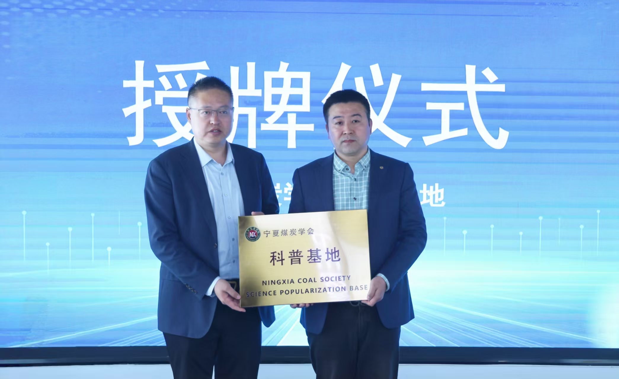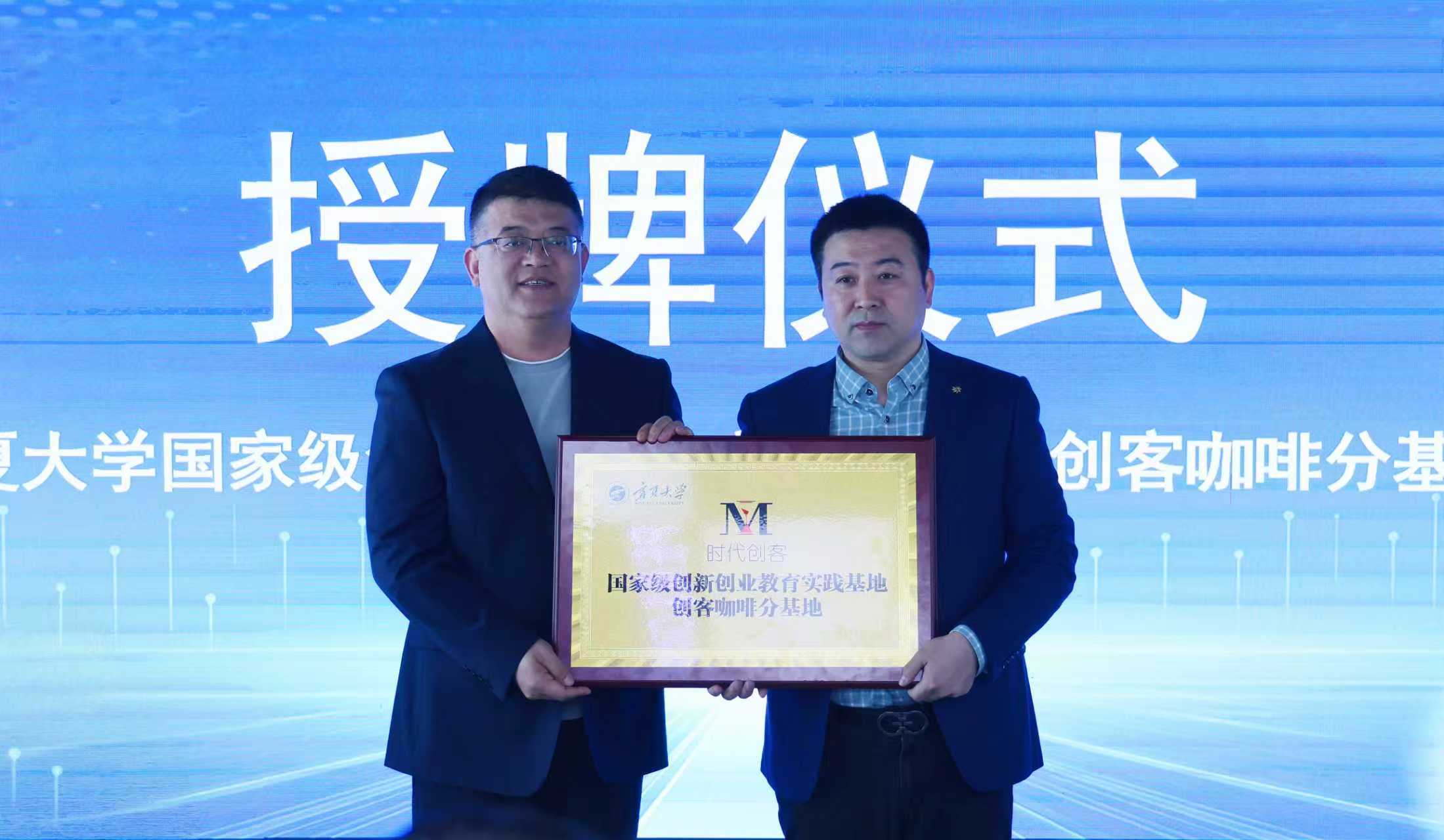 随后,创新创业学院院长冯蛟与宁夏大学科技园发展有限公司总经理、宁夏煤炭学会理事长全晓虎,向未来安全主题咖啡馆负责人刘庆功校友(2003级新闻学专业)颁发了“宁夏大学国家级创新创业教育实践基地创客咖啡分基地”和“宁夏煤炭学会科普基地”牌匾。